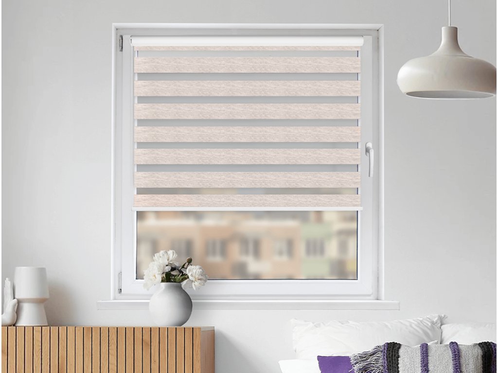Zatemňující okenní roleta Den a noc se vyrábí v délce 150 cm, 220 cm nebo 240 cm a v šířce 30 cm až 240 cm. Roletu dodáme včetně mechanismu pro ovládání řetízku o délce 1 m nebo 1,5 m a kompletní sady pro upevnění.